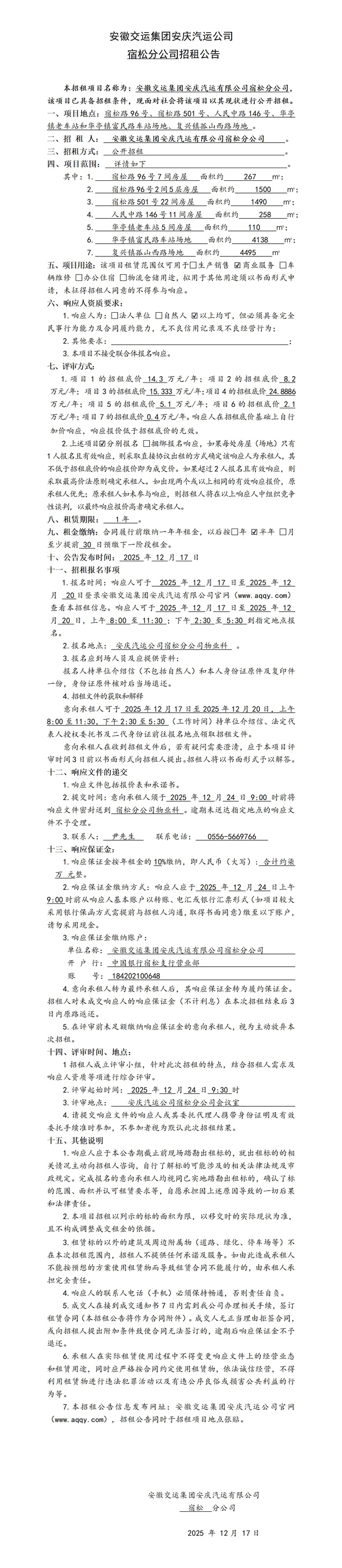 宿松分公司房屋(場地)招租公告