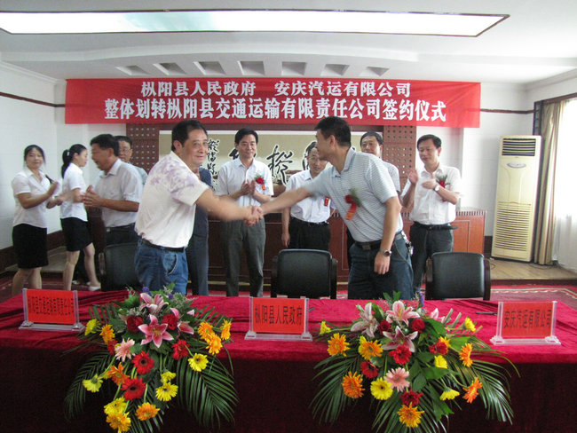 2011年9月1日,樅陽(yáng)縣人民政府、安徽省交通集團(tuán)安慶汽運(yùn)有限公司整體劃轉(zhuǎn)樅陽(yáng)縣交通運(yùn)輸有限責(zé)任公司簽約儀式在樅陽(yáng)迎賓館會(huì)議大廳內(nèi)隆重舉行。樅陽(yáng)縣縣長(zhǎng)何謙、副縣長(zhǎng)胡海峰,省交通集團(tuán)汽車運(yùn)輸有限公司副總經(jīng)理方詩(shī)喬,安慶汽運(yùn)有限公司董事長(zhǎng)張進(jìn)、黨委書記徐軍、副總經(jīng)理王中明、彭宏、紀(jì)委書記郭峰,樅陽(yáng)縣交通運(yùn)輸有限責(zé)任公司經(jīng)理童子健出席了簽約儀式。
