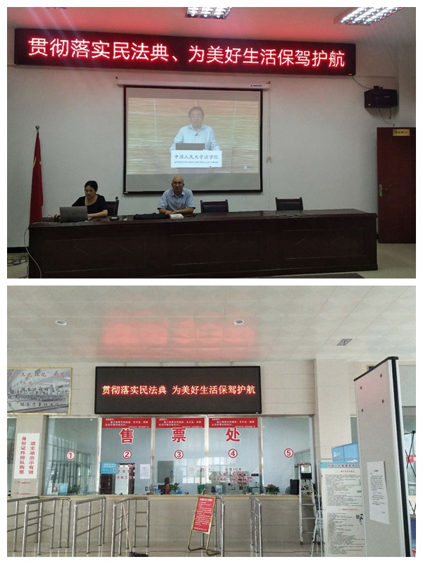 7月14日,岳西分公司在車站站前廣場(chǎng)電子屏幕上滾動(dòng)播放了“貫徹落實(shí)民法典,為美好生活保駕護(hù)航”等宣傳標(biāo)語。