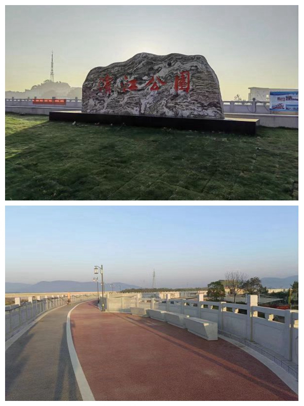 昔日因防洪墻改造而搬遷的公司舊址已變成濱江公園,現(xiàn)已成為小城一道亮麗的風(fēng)景!盀I江公園”四個(gè)紅色的大字,蒼勁有力,深深印在有底座的巨石之上,在小城的晨光里熠熠生輝,象征小城百折不撓精神的靈璧石,似牛似象,撫慰心靈。各種名貴的樹木、景觀石、兒童游樂場鑲嵌其中,各種健身器材呈圓形分布開,健身過后還可登上防洪墻,寬大的墻體頂部由紅、黑兩色鋪成的瀝青路面,可滿足不同游客的需求(慢跑和競走),百十米就有石凳靜候、亭臺(tái)守望。如果沒有波光粼粼的長河相伴,你會(huì)以為在步履“長城”。