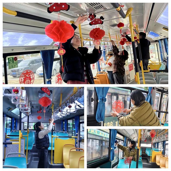 太湖公交分公司從網(wǎng)上精選現(xiàn)代窗花,搭配寓意深遠(yuǎn)的生肖燈籠,把年俗文化與時(shí)代印記巧妙融入八米車廂,讓濃濃的年節(jié)氣息伴隨每一位乘客的旅途。許多乘客一上車,看到福字和馬年燈籠,就紛紛感慨:“特別有過(guò)年的感覺,心里暖洋洋的!”